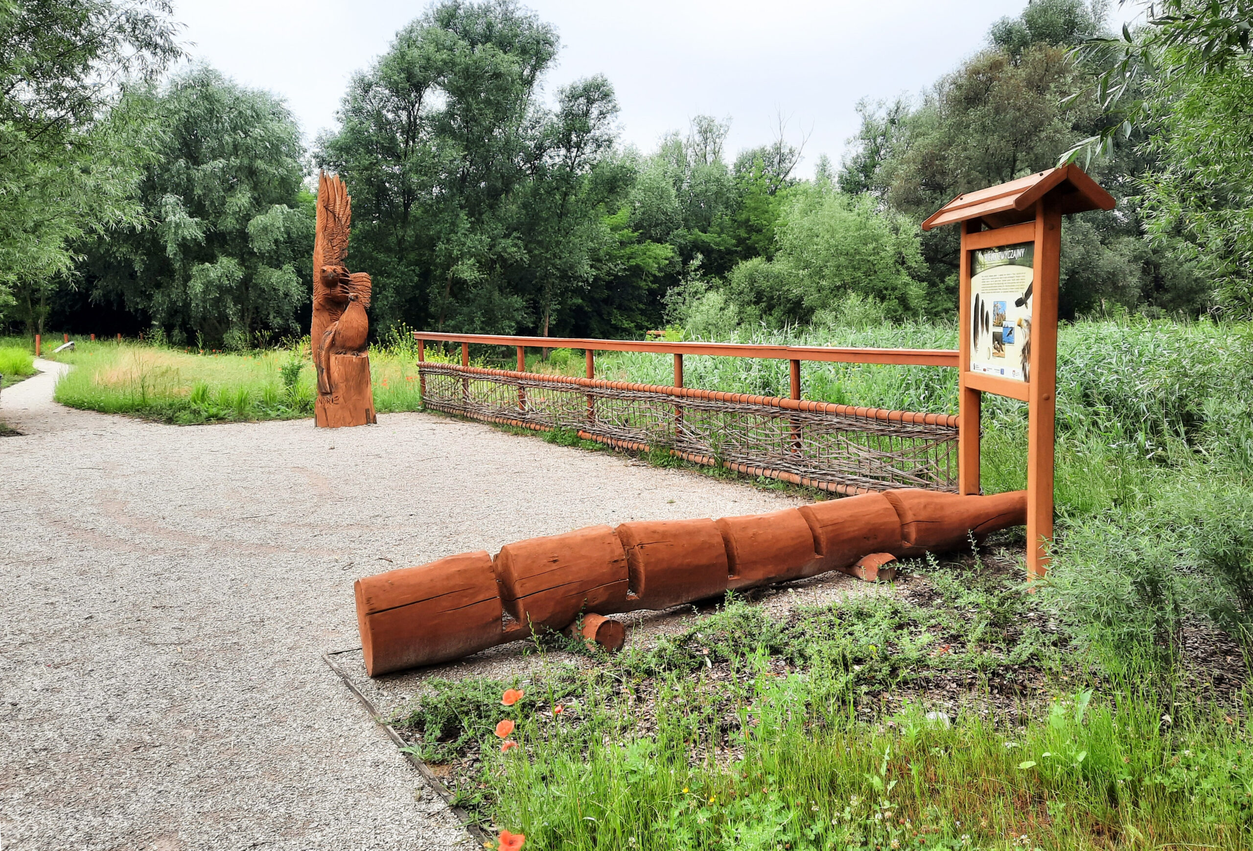 W ramach zadania opracowano i zrealizowano projekt zieleni dla obszarów osiedli Modlin Stary, Osiedle Młodych oraz Pólko, współfinansowany ze środków Programu Operacyjnego Infrastruktura i Środowisko 2014–2020. Inwestycja przyczyniła się do kompleksowej poprawy jakości przestrzeni zielonych, ze szczególnym uwzględnieniem terenu Osiedla Pólko przy ul. Nadrzecznej. W ramach projektu wykonano nowe, bioróżnorodne nasadzenia krzewów, bylin oraz roślin bagiennych, które wzmocniły walory przyrodnicze i krajobrazowe tego obszaru. Przeprowadzono oczyszczenie zbiornika wodnego, ukształtowano i umocniono jego brzegi poprzez odpowiednie nasadzenia roślinne oraz wyrównano i zagospodarowano teren wokół akwenu. Uzupełnieniem działań było wykonanie nowej alejki spacerowej o nawierzchni mineralnej oraz montaż elementów małej architektury, w tym ławek, koszy na śmieci i stojaka rowerowego. Projekt wzbogacono również o ścieżkę edukacyjną z tablicami informacyjno‑edukacyjnymi, tworząc atrakcyjną przestrzeń rekreacyjną, sprzyjającą wypoczynkowi, edukacji ekologicznej i integracji mieszkańców.