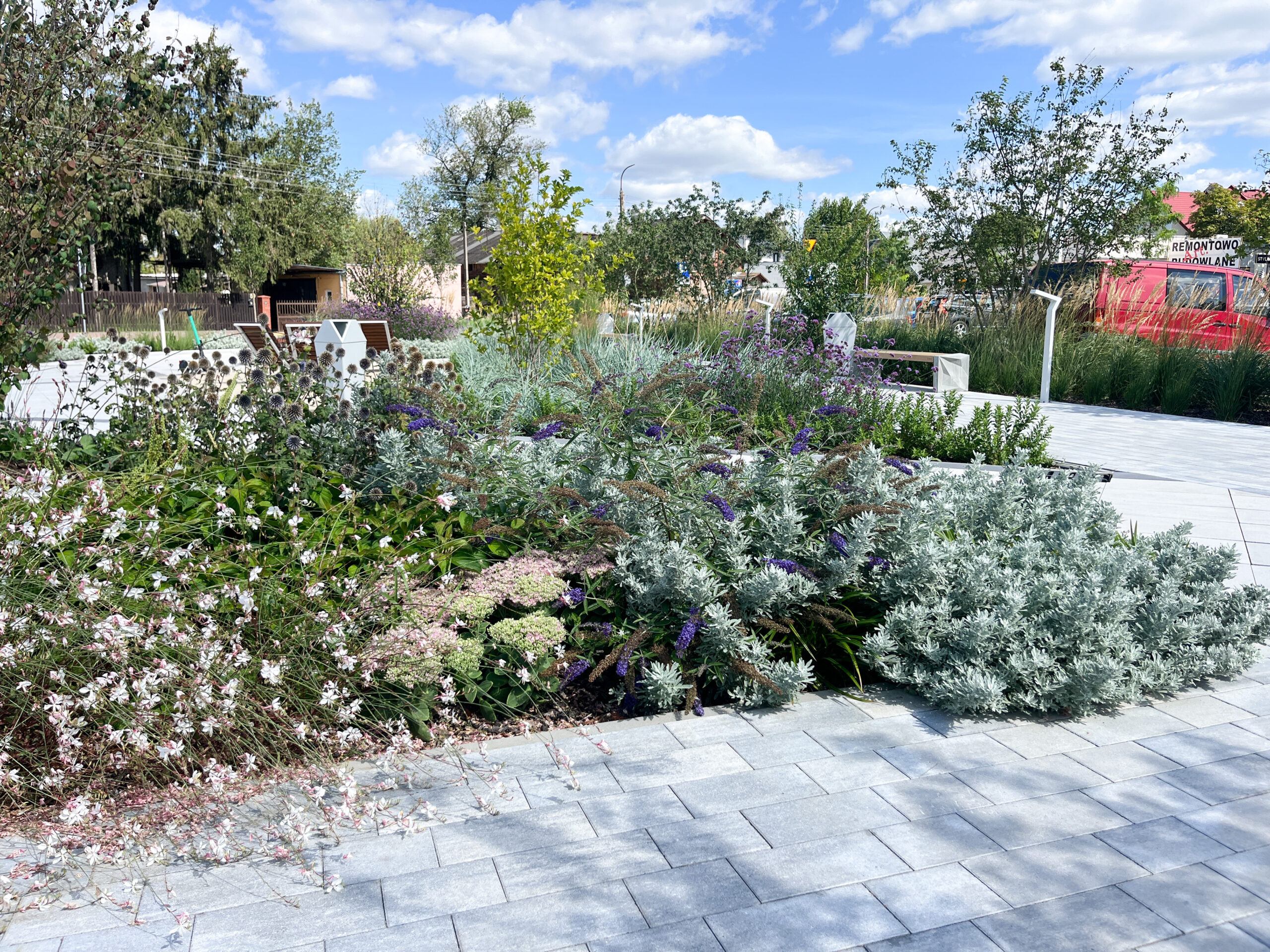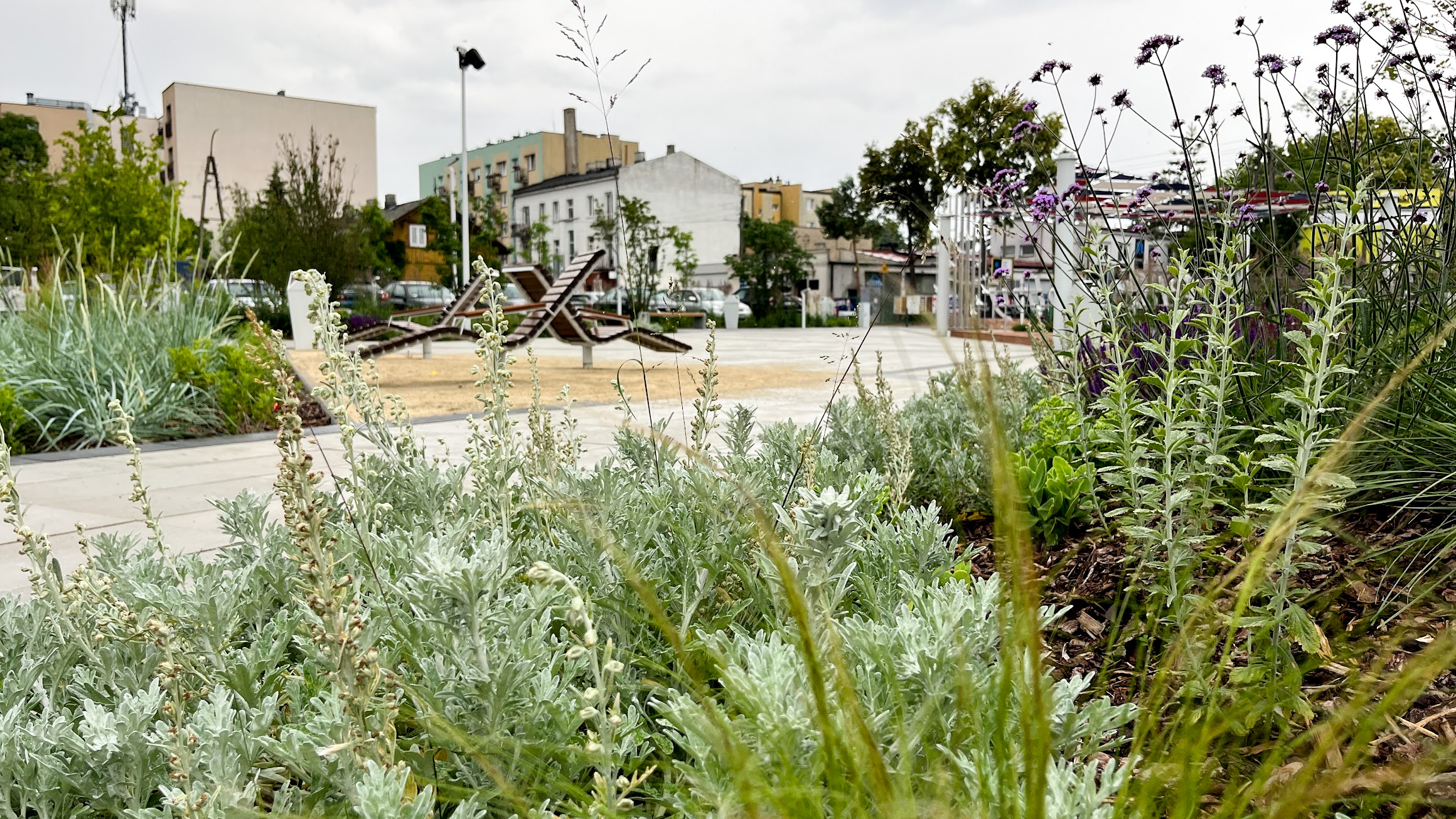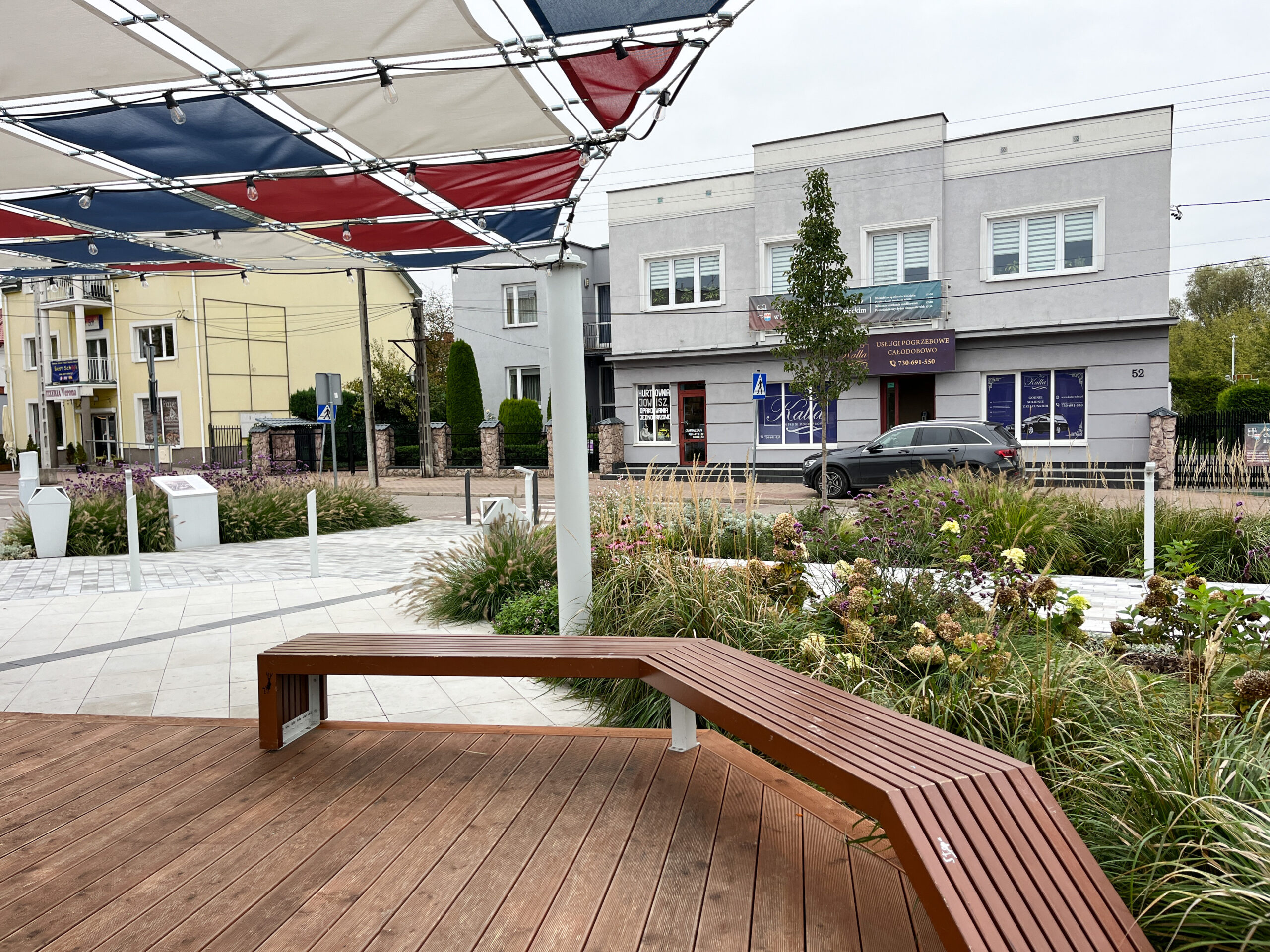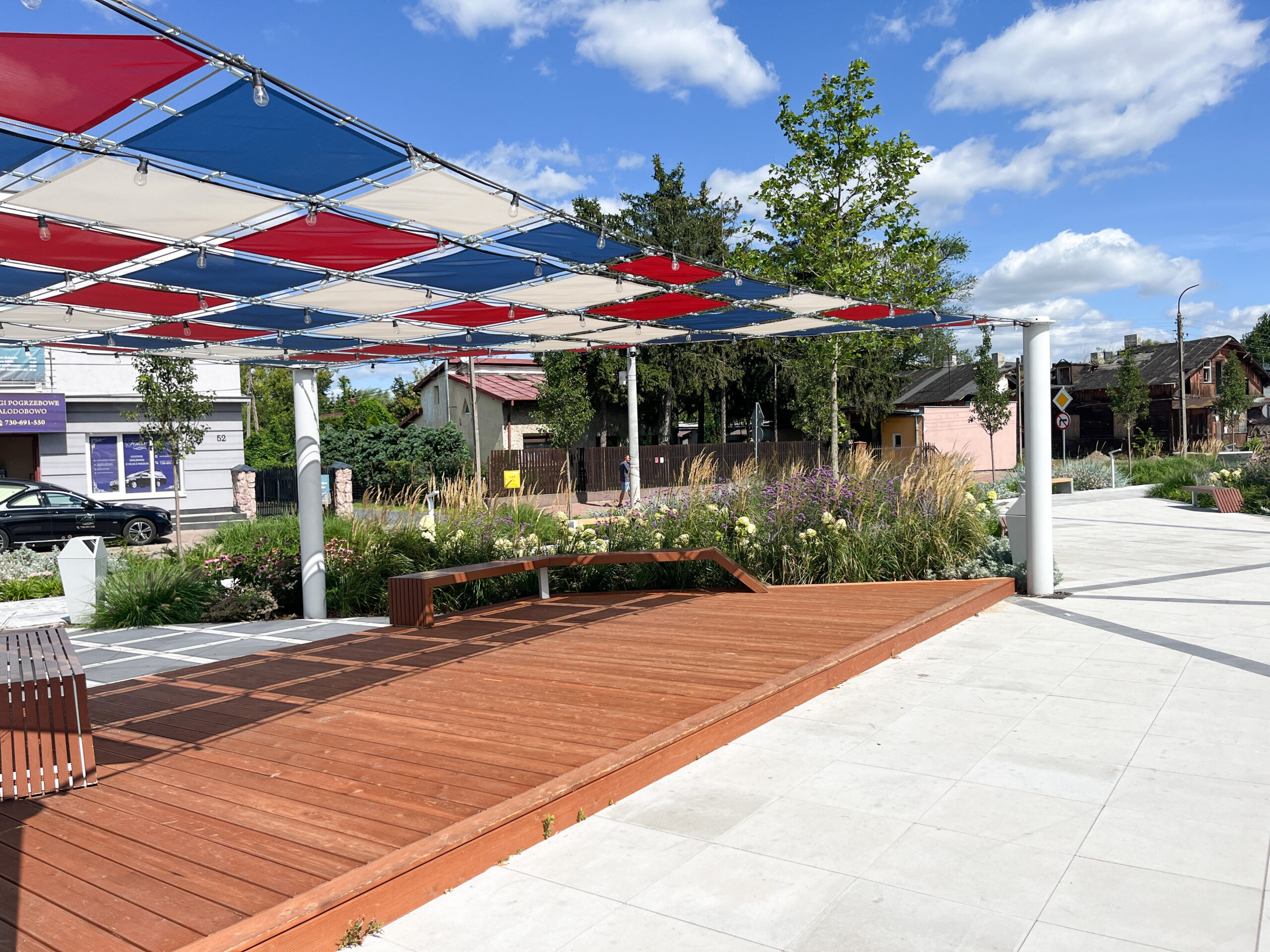 Projekt rewitalizacji Placu Solnego w Nowym Dworze Mazowieckim to kompleksowa odpowiedź na potrzeby mieszkańców w zakresie jakości przestrzeni publicznej, zieleni i rekreacji. Inwestycja obejmowała przebudowę Placu Solnego wraz z fragmentami ulic Sukiennej, Daszyńskiego, Lotników i Przejazd, w celu stworzenia spójnego, funkcjonalnego i estetycznego wnętrza miejskiego. Nowa aranżacja zakładała zmianę użytkowania przestrzeni z zaniedbanego ogólnodostępnego miejskiego parkingu o nawierzchni utwardzonej w przyjazny zielony skwer rekreacyjny z jednoczesnym utrzymaniem miejsc postojowych w odpowiedzi na potrzeby mieszkańców. Prace objęły wymianę zdegradowanych nawierzchni, budowę miejsc postojowych, montaż małej architektury – w tym obszernego zadaszenia i fontanny w postaci rzeźbiarskiej dominanty oraz nowoczesnego oświetlenia. Wykonanie bogatych nasadzeń roślinnych na całym placu i montaż zadaszonej pergoli pozwoliły zmniejszyć miejska wyspę ciepła w tym rejonie. Realizacja zadania podniosła komfort użytkowania tego obszaru, poprawiła bezpieczeństwo oraz przyczyniła się do wzrostu atrakcyjności centrum miasta.